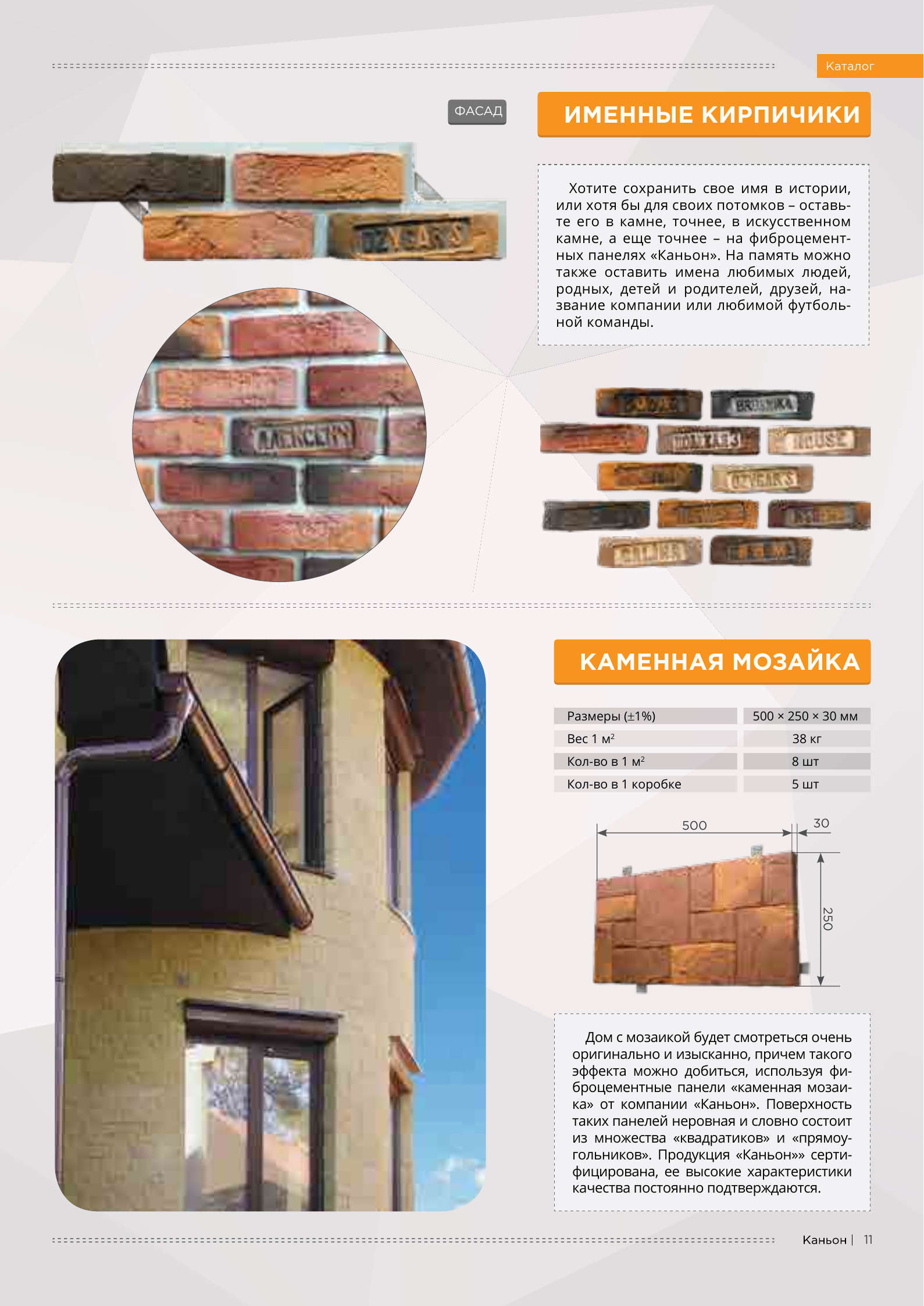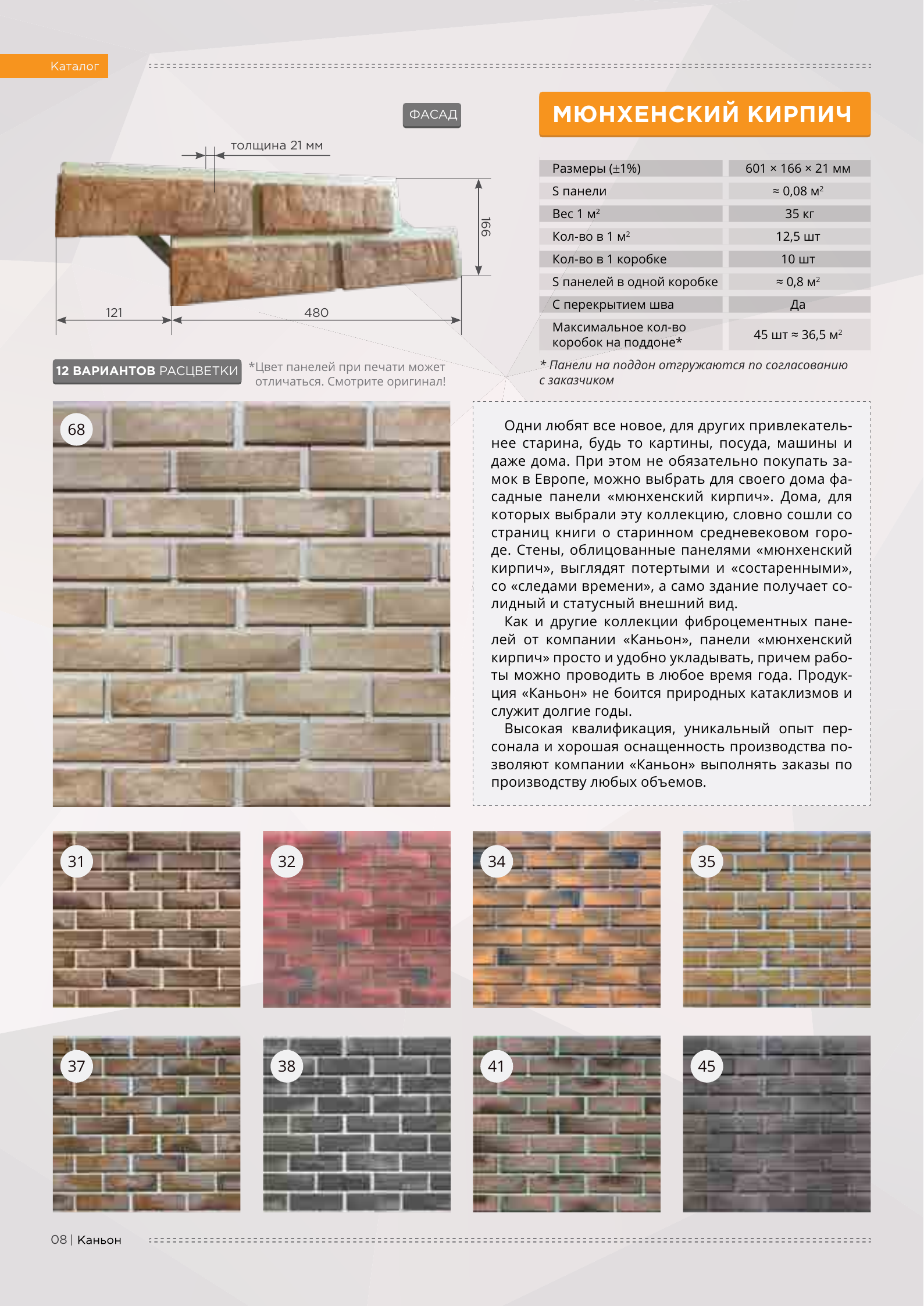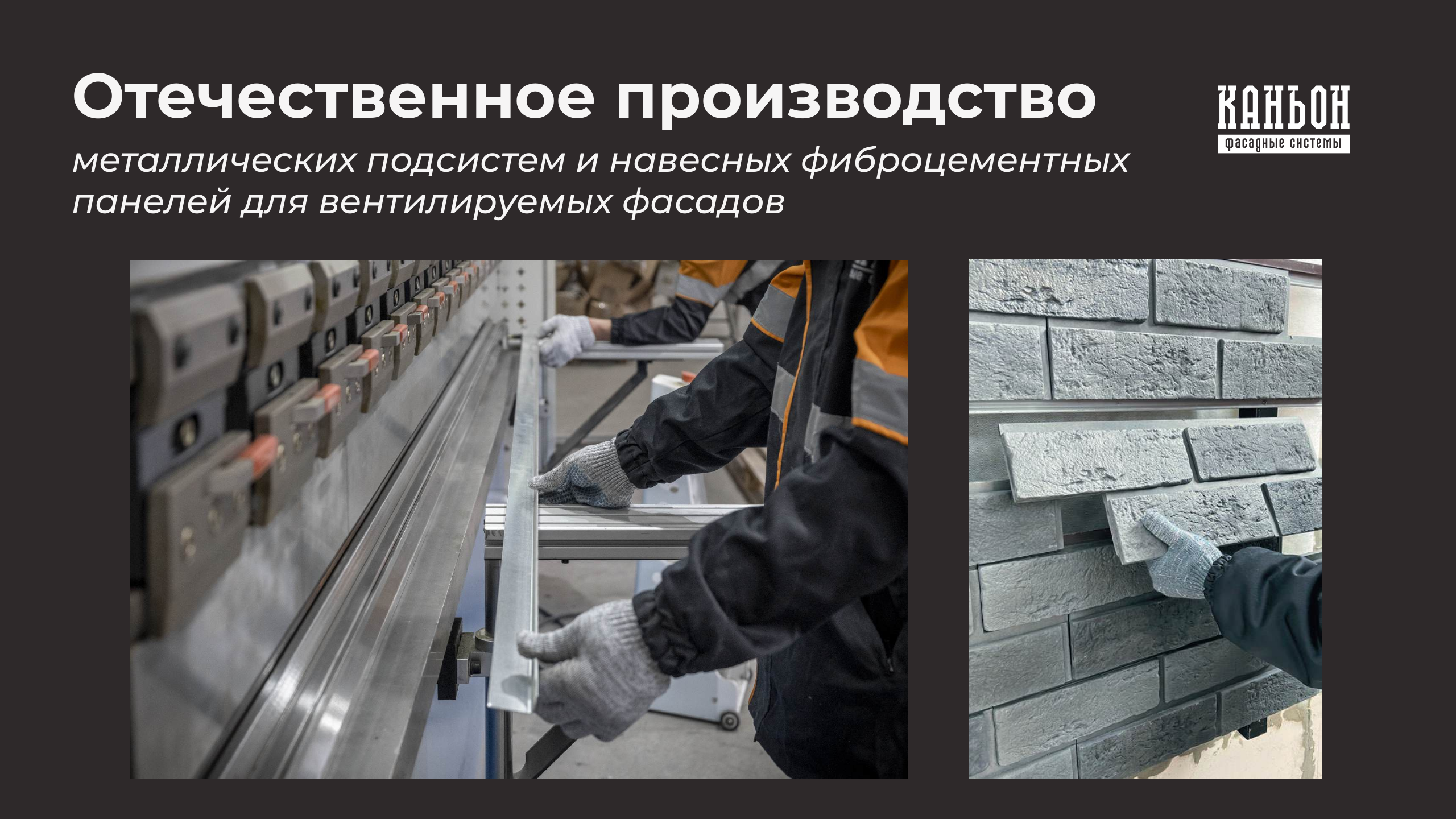 Вот уже более 20 лет российский производитель фасад-ных систем «Каньон» воплощает мечты многих сотен домовладельцев — сделать свой дом красивым и современным, благодаря облицовке фасадов домов панелями нашего пред-приятия. Наша компания обладает своими производственными площадями в 6,5 тысяч м2, расположенных на 3 Га земли. Панели «Каньон» производятся из модифицированного цветного фибробетона, прекрасно имитируют кирпичную или каменную кладку, обладают высокими прочностными характеристиками. Основное отличие фиброцементных панелей «Каньон» - наличие металлических крепежных пластин из оцинкованной стали. Такая технология позволяет крепить наши панели на любую поверхность, будь то брус, кирпич, газоблок, бревно, СИП-панель и проводить монтажные работы в любое время года. Высокая квалификация, уникальный опыт персонала и хорошая оснащенность производства позволяют компании «Каньон» выполнять заказы по производству любых объемов.