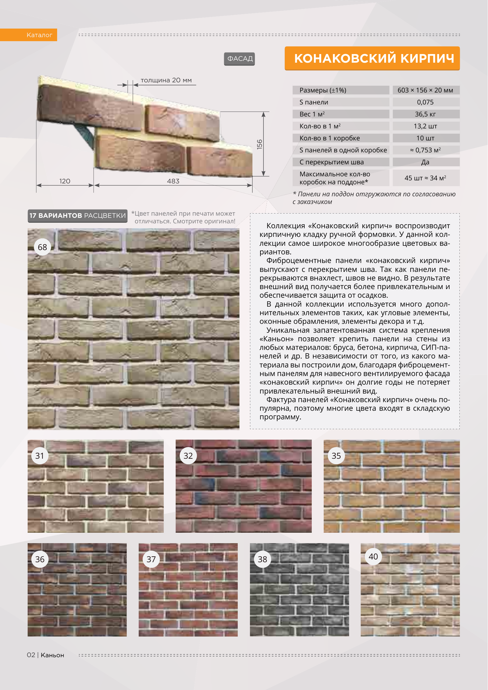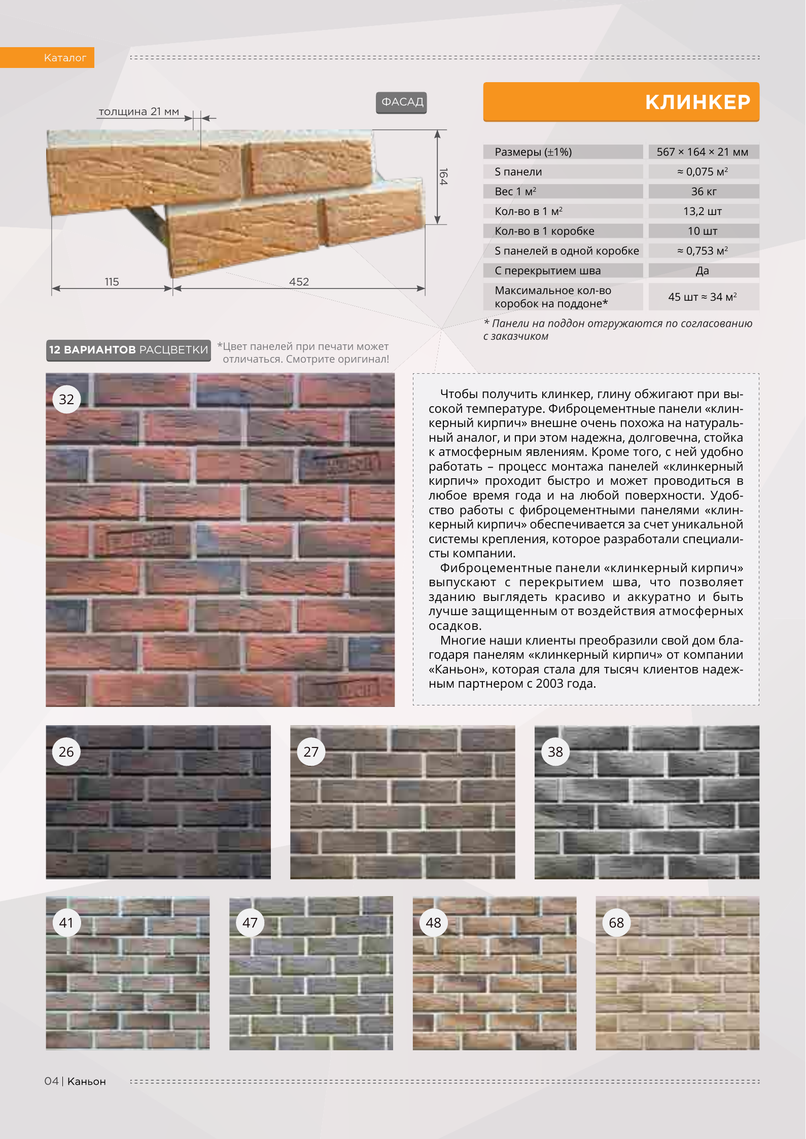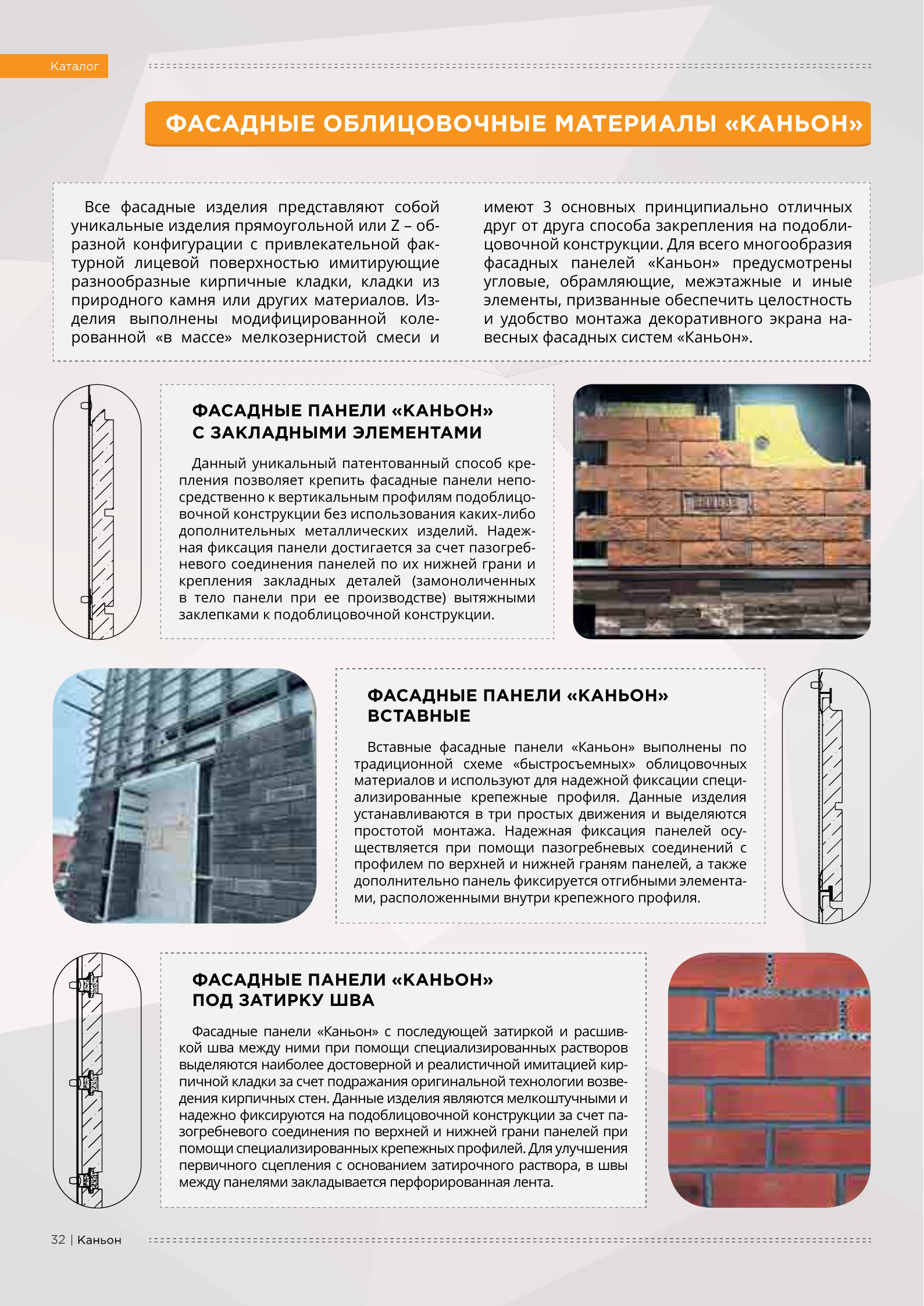 Вот уже более 20 лет российский производитель фасад-ных систем «Каньон» воплощает мечты многих сотен домовладельцев — сделать свой дом красивым и современным, благодаря облицовке фасадов домов панелями нашего пред-приятия. Наша компания обладает своими производственными площадями в 6,5 тысяч м2, расположенных на 3 Га земли. Панели «Каньон» производятся из модифицированного цветного фибробетона, прекрасно имитируют кирпичную или каменную кладку, обладают высокими прочностными характеристиками. Основное отличие фиброцементных панелей «Каньон» - наличие металлических крепежных пластин из оцинкованной стали. Такая технология позволяет крепить наши панели на любую поверхность, будь то брус, кирпич, газоблок, бревно, СИП-панель и проводить монтажные работы в любое время года. Высокая квалификация, уникальный опыт персонала и хорошая оснащенность производства позволяют компании «Каньон» выполнять заказы по производству любых объемов.